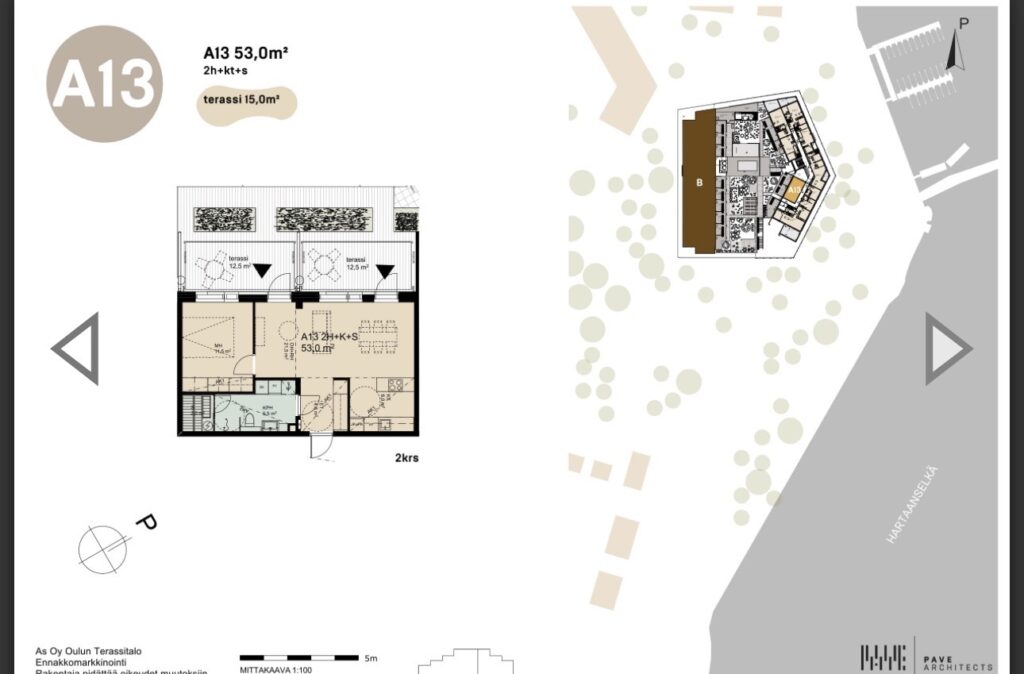 As Oy Oulun Terassitalot rakennetaan Oulun Asuntomessualueelle, kortteliin 44. Vaakunakyläntie 12, 90510 Oulu. A13 sijaitsee 2-kerroksessa ja huoneistolla iso oma terassi.Oiva kohde sijoitukseen tai omaksi.