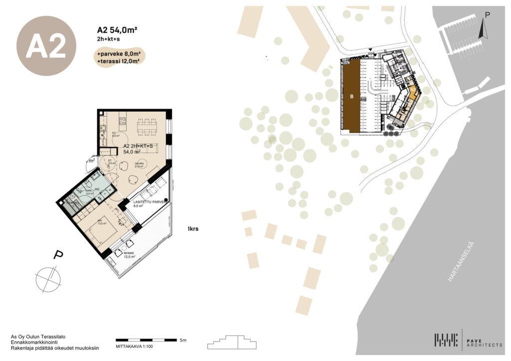 As Oy Oulun Terassitalot rakennetaan Oulun Asuntomessualueelle, kortteliin 44. Vaakunakyläntie 12, 90510 Oulu. A2 huoneisto sijaitsee 1-kerroksessa, joka on huikea kulmahuoneisto ja siinä on lasitettua parveketta 8 m2+ terassia 12 m2, Huoneistosta on huikeat vesistönäkymät Hartaanselälle.
