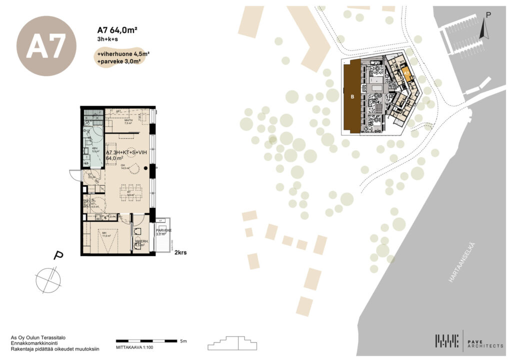 Kauniin Oulujoen suistomaisemaa siivittämät asunnot tulevat viiteen kerrokseen. Talojen porrasmainen muoto mahdollistaa päädyissä oleville asunnoille asuinneliöiden lisäksi myös hulppeat kattoterassit. Asuntojen koot vaihtelevat suurista kaksioista isompiin perheasuntoihin ja jopa 147 m2 huoneistoon, jossa lisänä lähes samankokoinen terassi! Asuntoja on myös kahdessa kerroksessa Loft -tyylisesti, jolloin maiseman saa asuntoihin molemmissa kerroksissa! Kohteen suunnittelijana toimii Oululainen Pave Arkkitehdit Oy.