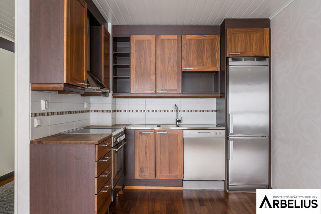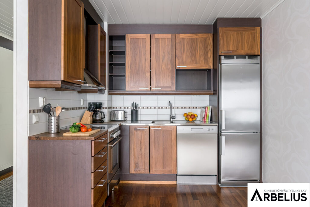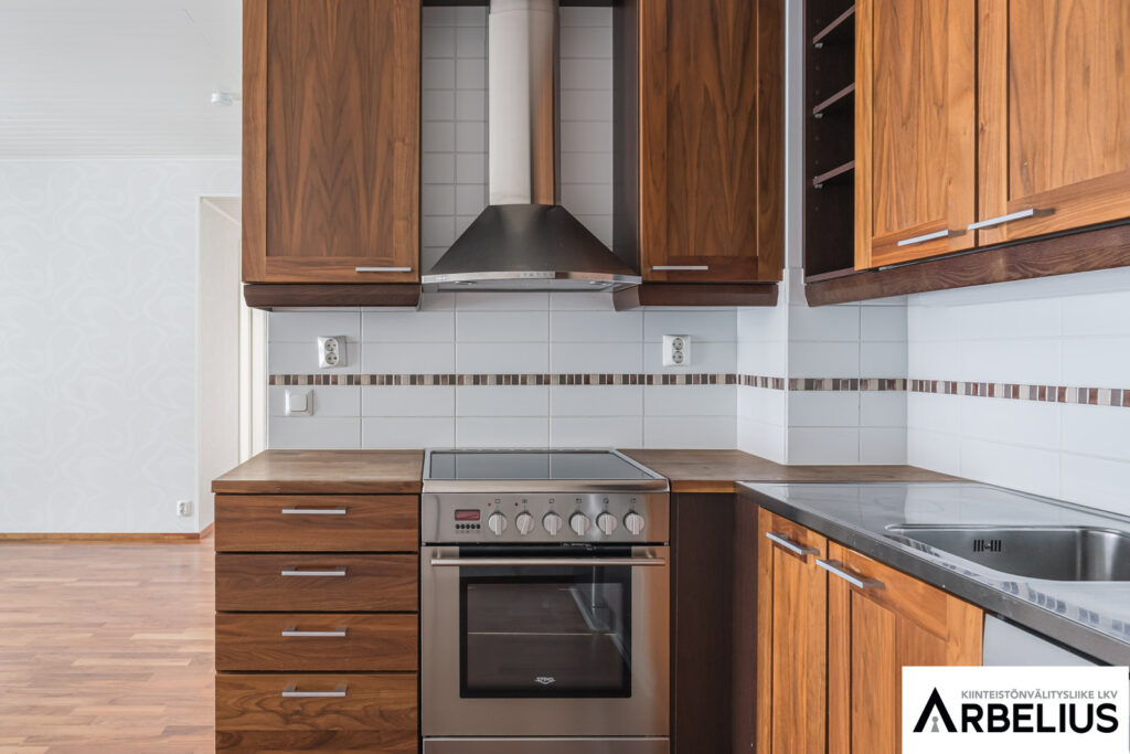 Keittiön kuvaus Keittiön kiintokalusteet ja laitteet on tasokorotettu rakennusvaiheessa.