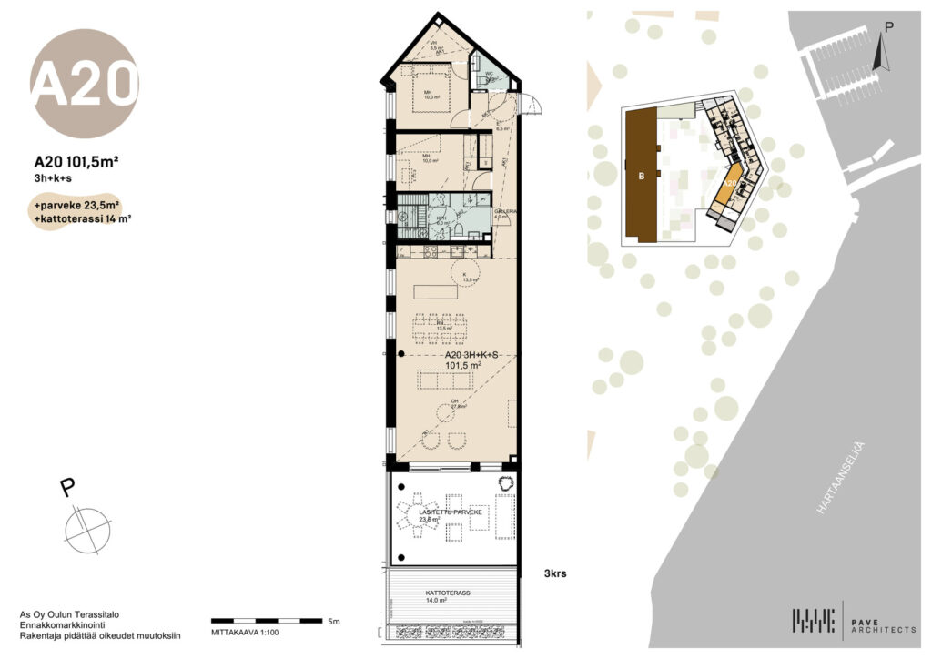As Oy Oulun Terassitalot rakennetaan Oulun Asuntomessualueelle, kortteliin 44. Vaakunakyläntie 12, 90510 Oulu. A20 huoneisto sijaitsee 3-kerroksessa jossa on 23 m² lasitettu parveke ja 14 m² kattoterassi. Huoneistosta on huikeat vesistönäkymät Hartaanselälle.